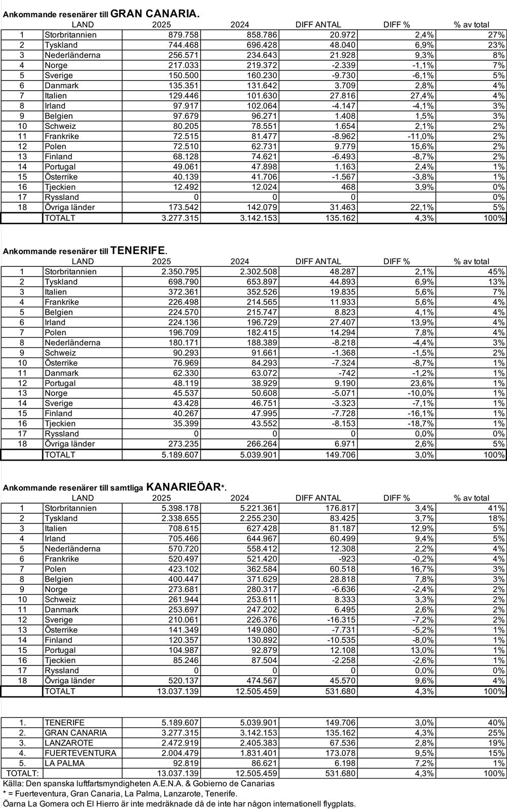 Vid denna tidnings pressläggning hade myndigheterna ännu inte publicerat statistiken för ankommande besökande under november månad. Därför väljer vi att publicera statistiken för Gran Canaria, Tenerife och för ö-gruppen totalt när det gäller antal ankommande från årsskiftet 2025 och fram till oktober månads slut. Trots avsaknad av officiella siffror så har en del fakta publicerats av en del lokala tidningar. Siffror som alltså fortfarande är obekräftade.